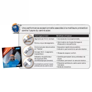 Disque diamant 350 mm de la gamme Super Asphalt Evo de chez NORTON© Clipper destiné à l’asphalte, l’asphalte sur béton et aux matériaux abrasifs. Excellent rapport qualité/prix pour un disque soudé laser avec segments de hauteur 10 mm. Contrôle permanent de la profondeur de coupe grâce aux indicateurs brevetés. Protection du centre acier contre l’abrasion par segments inclinés. Support : tronconneuse Diamètre : Ø 350 mm Alèsage : 20 mm Segment : H 10 mm / Ep. 3,2 mm Poids : 3 kg