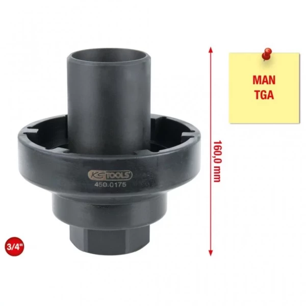 Carré d’entraînement selon DIN 3121 / ISO 1174 Avec entraînement six pans 60 mm Grande exactitude Version renforçée Guide de coiffage optional conçu pour de forts couples de des/serrage En acier spécial Utilisations : Essieu arrière MAN-TGA HY-1350 (Hypoid) Matériel 1: Outil en alliage spécial Carré d’entraînement en pouce: 3/4″ Norme: ISO 1174, DIN 3121 Nombre d’embouts: 6 H1: 98 H2: 160 Largeur d’embout B: 11.5mm 6 pans extérieur: 60 Diamètre intérieur D2: 133mm Diamètre extérieur D1: 148mm Diamètre d’embout interne D3: 117mm Tube de guidage D4: 67mm Poids: 4.5 kg