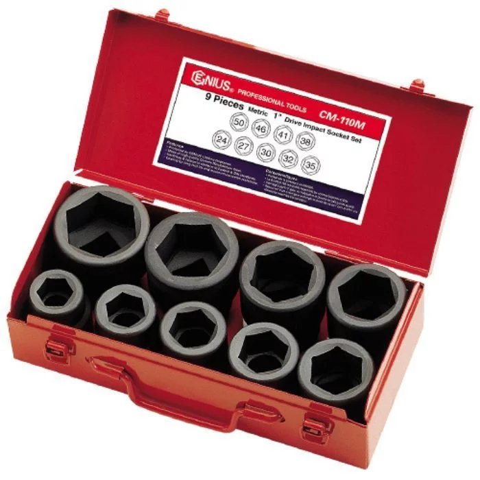 Coffret métallique avec 9 pièces. Coffret de 9 douilles a chocs de 1 » de 24 a 50 mm. Au chrome molybdène Coffret métallique Carré d’entraînement en pouce: 1 »  Composition: 24-27-30-32-35-38-41-46-50 mm