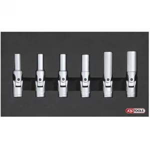 Coffret 6 pièces de douilles courtes articulées 3/8, spéciales bougies de préchauffage, Garantie à vie ! (dans des conditions normales d’utilisations). Composition du coffret : Type de douille : douilles articulées Carré d’entrainement : 3/8’’ Dimensions diamètre : 8 – 9 – 10 – 12 – 14 – 16 mm Empreinte : 6 pans Pour bougie de préchauffage Matière : Chrome Vanadium Module adaptable dans les servantes d’atelier 12 tiroirs KSTools Vendu en coffret composite Poids : 0,7 kg
