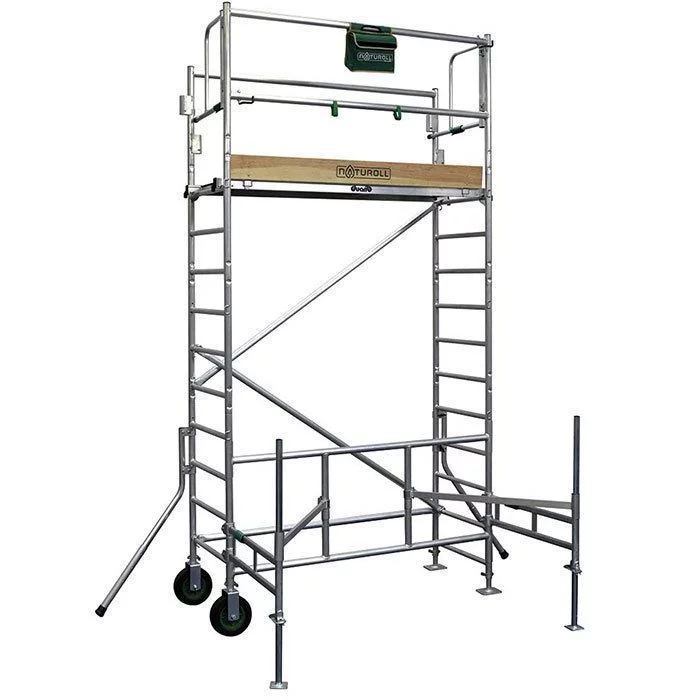Le système d’échafaudage Naturoll se déploie rapidement grâce à sa base pliante pratique, et il est équipé de goupilles imperdables. Cet échafaudage vous permet d’effectuer la taille des haies dans des conditions optimales de confort et de sécurité. Les roues sont résistantes et ne se dégonflent pas. De plus, il est pourvu d’un sac porte-outils transportable d’une capacité de 5 kg, ainsi que de deux crochets porte-outils qui maintiennent les outils en toute sécurité lors des déplacements et permettent de monter en gardant les mains libres. Les pieds réglables et le stabilisateurs à réglage millimétriques permettent de s’installer sur divers terrains et d’offrir une excellente stabilité. Caractéristiques : Hauteur de travail : 2,25 mètres. Longueur : 1,90 m – Largeur : 0,75 m. Dim. extérieures : Longueur : 2,08 m – Largeur : 0,80 m. Dim. base pliante : L. 1,87 x H. 1,30 x Ep. 0,25 m. Aluminium. Plancher aluminium et contreplaqué antidérapant et imputrescible. Surface utile : 1,80 x 0,60 m. Nombre de niveaux de plancher : 1 Charge admissible sur un plancher : 200 kg. Sac porte-outils – capacité 5 kg. 2 crochets porte-outils: permet de monter les mains libres et sécurise les outils pendant le déplacement. Roues diam.260 mm, largeur bandage 80 mm et réglage sur 600 mm tous les 100 mm. Diamètre des montants : 45 mm. Poids: 66.8 kg. Composition de l’échafaudage: 2 Pièce x Socle avec roue Ø 260 mm, charge maxi 150 kg / sur la photo repère 1 2 Pièce x Tige à trous / sur la photo repère 2 1 Pièces x Corps de base / sur la photo repère 3 1 Pièces x Lisse Déclic / sur la photo repère 4 2 Pièces x Stabilisateur RS4+vert / sur la photo repère 5 2 Pièces x Diagonale pour stabilisateur RS4 / sur la photo repère 6 . Pièces x Échelle de 0,75 m / sur la photo repère 7 . Pièces x Diagonale Déclic / sur la photo repère 8 1 Pièces x Plancher modulaire sans trappe / sur la photo repère 9 1 Pièces x Plinthe latérale / sur la photo repère 10 1 Pièce x Garde-corps de 1 m / sur la photo repère 11 1 Pièce x Barre de coupe / sur la photo repère 12 1 Pièce x Sac porte-outils en tissu / sur la photo repère 13 . Pièce x Stabilisateur NS1 / sur la photo repère 14 4 Pièce x Goupille clips sécurité Ø 8 mm pour tube Ø 50 mm des roues et des pieds / sur la photo repère 15 1 Lot de 12 goupilles clips sécurité Ø 8 mm pour tube Ø 40/50 mm des roues et des pieds (voir p.83)