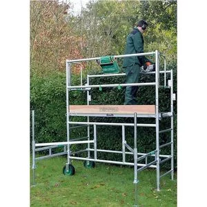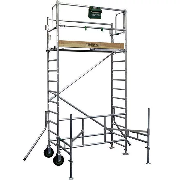 Le système d’échafaudage Naturoll se déploie rapidement grâce à sa base pliante pratique, et il est équipé de goupilles imperdables. Cet échafaudage vous permet d’effectuer la taille des haies dans des conditions optimales de confort et de sécurité. Les roues sont résistantes et ne se dégonflent pas. De plus, il est pourvu d’un sac porte-outils transportable d’une capacité de 5 kg, ainsi que de deux crochets porte-outils qui maintiennent les outils en toute sécurité lors des déplacements et permettent de monter en gardant les mains libres. Les pieds réglables et le stabilisateurs à réglage millimétriques permettent de s’installer sur divers terrains et d’offrir une excellente stabilité.