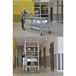 Il s’agit d’une base en forme de parallélogramme qui peut être dépliée facilement et se verrouille automatiquement sur les échelles de base. Il ne nécessite aucun goupillage pour une fixation sûre. Il est doté d’un plancher à double trappe ALTO en aluminium/bois ainsi que d’un verrouillage de stabilisateur à distance et d’un stabilisateur ajustable.