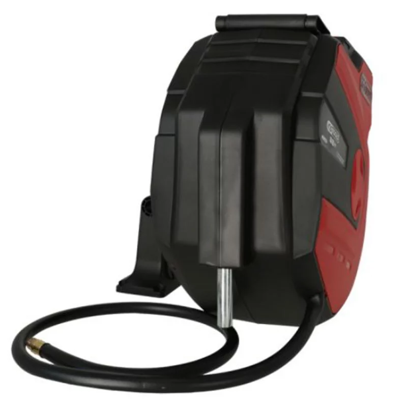 Enrouleur air et d’eau de 15 mètres, tuyau toujours rangé et prêt à l’emploi, équipé d’un retour automatique, d’un blocage en position, d’un support mural orientable à 180°.