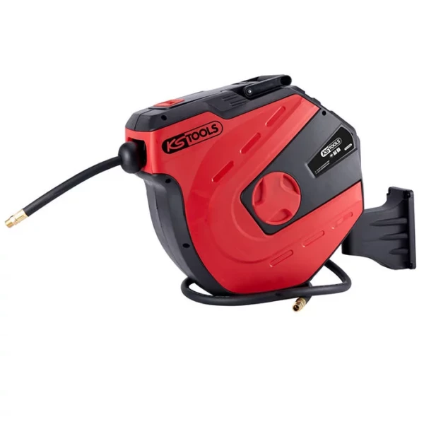 L’enrouleur est équipé d’un système de verrouillage pour maintenir le tuyau à la longueur désirée. Il est facile à installer, grâce à son support mural pratique. En plus de sa robustesse, il est léger et peu encombrant. Le boîtier en plastique résistant protège le tuyau des chocs et des intempéries. Enrouleur air eau 3/8 » 15 mètres KS TOOLS
