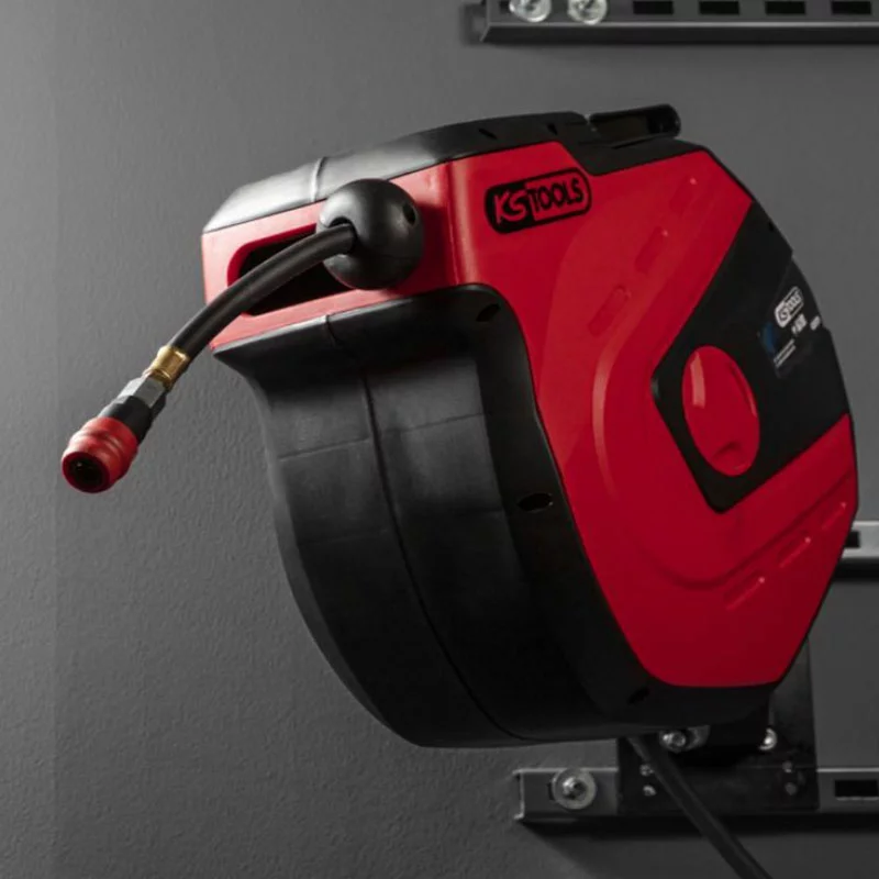Enrouleur air et d’eau de 15 mètres, tuyau toujours rangé et prêt à l’emploi, équipé d’un retour automatique.