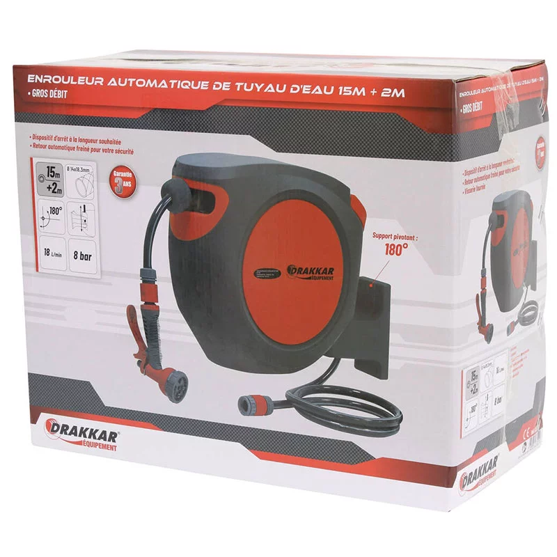 Enrouleur automatique de tuyau d’eau 15m + 2m – 3/8″ DRAKKAR est un outil pratique et fiable. Il facilite l’arrosage au quotidien. Il convient aussi bien au jardin qu’au garage. Ainsi, vous gagnez du temps. Et vous évitez les efforts inutiles.