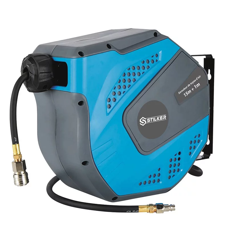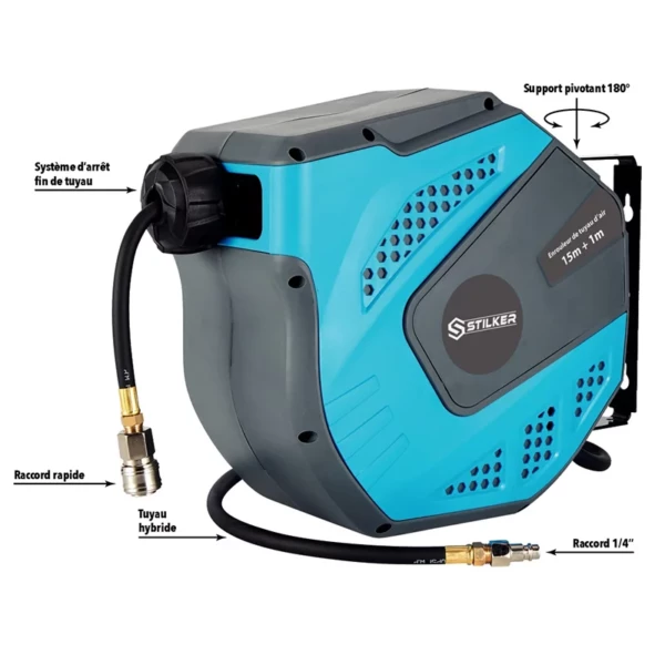 Ce tuyau pneumatique automatique, équipé d’un support pivotant à 180°, permet un usage flexible et pratique. Son retour automatique par ressort et son dispositif d’arrêt à la longueur souhaitée assurent un enroulement efficace. Conçu pour supporter une pression de 10 bars, il est robuste et adapté à diverses applications professionnelles.