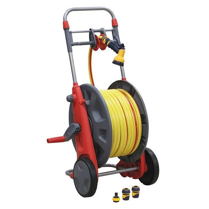 Enrouleur professionnel équipé de 50m de tuyau d’eau de 15mm et accessoires