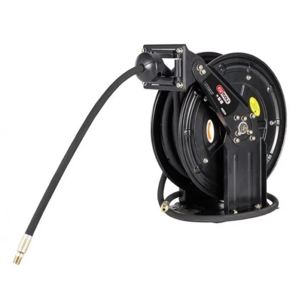 Le système de verrouillage maintient le tuyau en place, ce qui évite les enchevêtrements. De plus, l’enrouleur est équipé d’un support mural, ce qui facilite son installation dans votre garage ou votre atelier. Ce support permet d’économiser de l’espace au sol et d’accéder rapidement à votre tuyau.