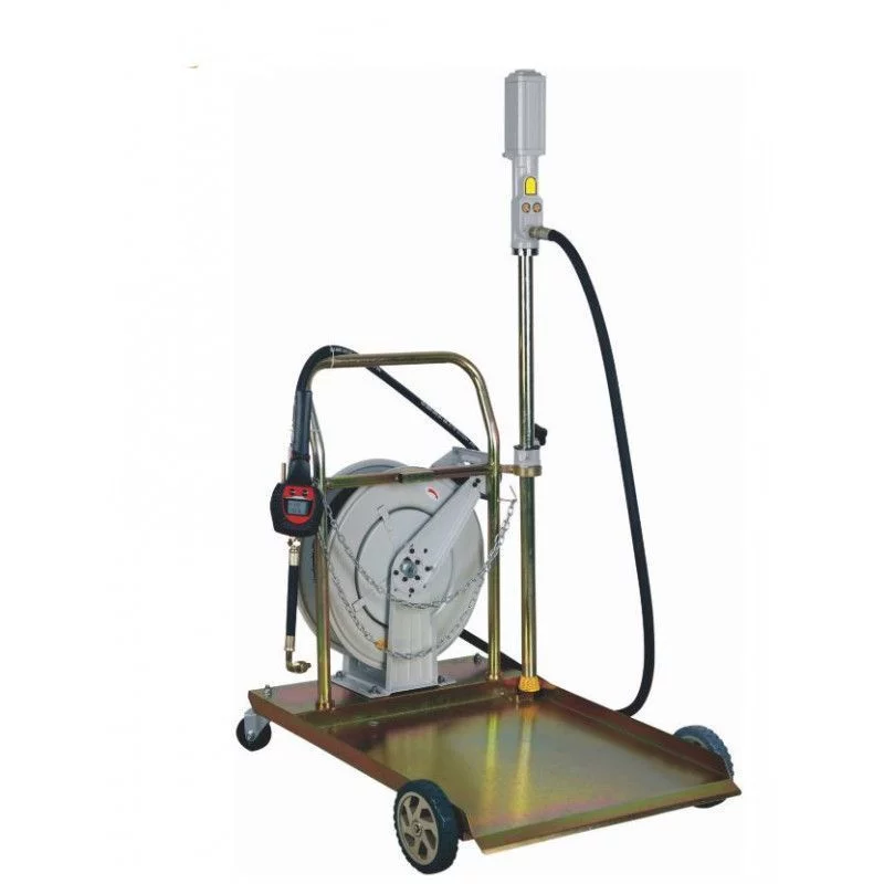 Ensemble pneumatique huile 180-220kg avec pistolet digital enrouleur de  10 mètres et chariot 4 roues.     Description: Rapport: 3:1. Pour fûts de 180-220 kg. Raccord entrée d’air:  1/4″. Pression d’utilisation: 6 à 8 bar. Consommation d’air: 240 l/min. Pistolet digital. Enrouleur tuyau: 10 Mètres. Tuyau: 1/2″- Longueur 10 Mètres. Débit:  27 Litres / minute. Longueur tube plongeur:  940 mm. Poids: 48.4 kg