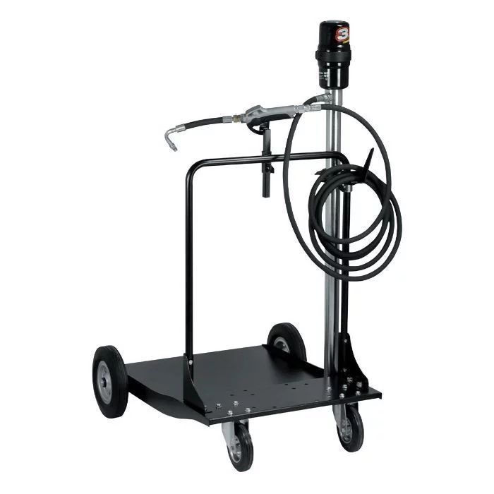 Ensemble pneumatique huile 180-220 kg avec pistolet manuel et chariot.     Description: Rapport: 3:1. Pour fûts de 180-220 kg. Raccord entrée d’air:  1/4″. Pression d’utilisation: 3 à 8 bar. Consommation d’air: 240 l/min. Pistolet manuel. Enrouleur tuyau: 10 Mètres. Tuyau: 1/2″- 5 Mètres. Débit: 21./minute. Rapport: 3:1. Longueur tube plongeur:  940 mm.