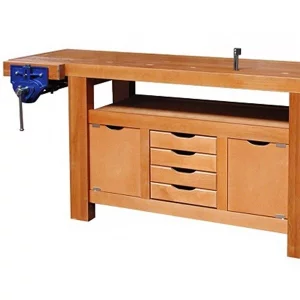 Etabli bois de menuisier professionnel longueur 2 mètres, plateau bois multiplies 70 mm avec ceinture bois massif 70 mm. Piètement massif de section 100 x 70 mm, équipé de Caisson avec 4 tiroirs et 2 Portes.
