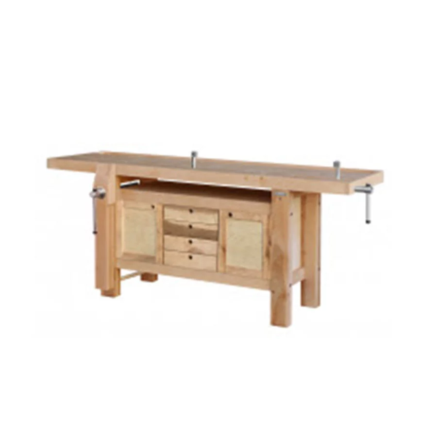 Plateau en carrelets massifs épaisseur 70 mm, avec goulotte de rangement pour dégager rapidement l’espace de travail en gardant ses outils à portée de main. Bâti massif avec piètement renforcé 100 x 70 mm. Espace de rangement entre le plateau et le caisson.