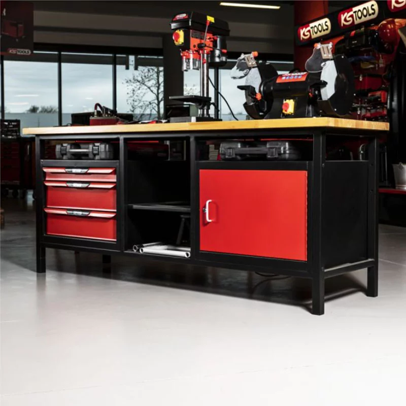 Établi d’atelier professionnel KSTOOLS® avec 1 porte et 3 tiroirs. Peinture époxy, avec un plateau bois massif d’une épaisseur de 40 mm. cet établi d’atelier bénéficie d’une grande stabilité, il est équipé d’une porte avec serrure (2 clés fournies), de tiroirs montés sur roulements à billes avec système de sortie totale.