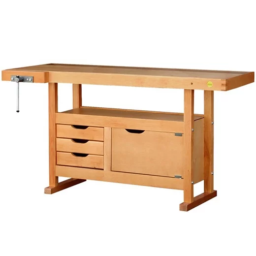 Établi de menuisier professionnel de 1,5 mètre à caisson avec 3 tiroirs muni d’une presse avant horizontale màchoire bois , très peu encombrant. Caractéristiques: Plateau en bois multiplis 25 mm avec ceinture bois massif 70 mm Piètement de section : 50 x 40 mm avec semelles. Rangements : Caisson avec 3 tiroirs Tiroirs : 340 x 310 x h 85 mm 1 Porte : 505 x h 270 mm. Espace de rangement entre le plateau et le caisson. Goulotte de rangement. Serrage : Presse avant horizontale mâchoire bois, vis acier Ø 18 mm. Largeur 320 mm, ouverture max 170 mm. Dimensions : Longueur : 150 x Largeur 50 x Hauteur 82 CM Poids : 35 kg