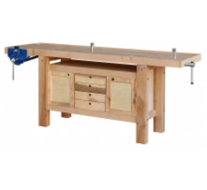 Plateau en carrelets massifs épaisseur 70 mm, avec goulotte de pour dégager rapidement l’espace de travail en gardant ses outils à portée de main.