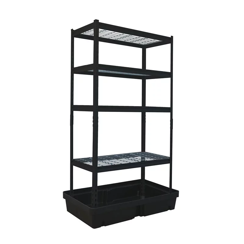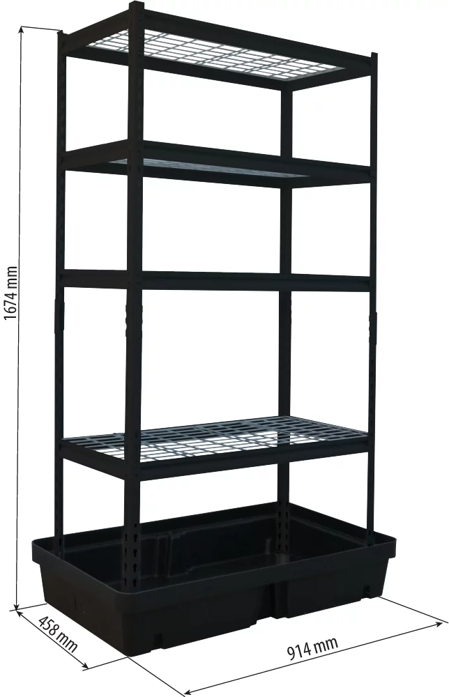 Etagère métallique avec une capacité de charge maximale de 1000 kg, 4 tablettes de 250 kg chacune. Bac de rétention de 60 L, en polyéthylène, résistant aux produits chimiques.