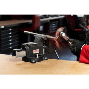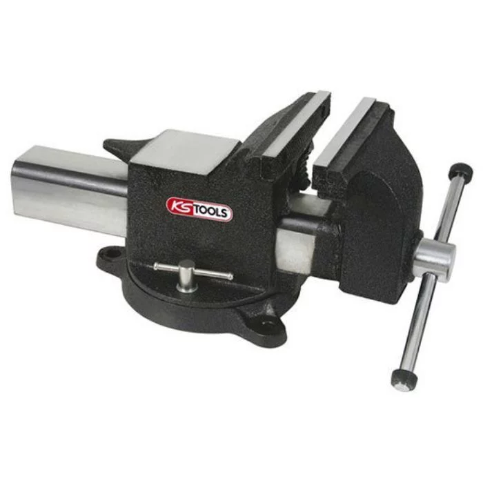 Etau en acier KS TOOLS. Équipé d’une base tournante et de mors interchangeables en acier trempé, cet étau est aussi munie d’une ouverture vers l’avant, et d’une enclume.