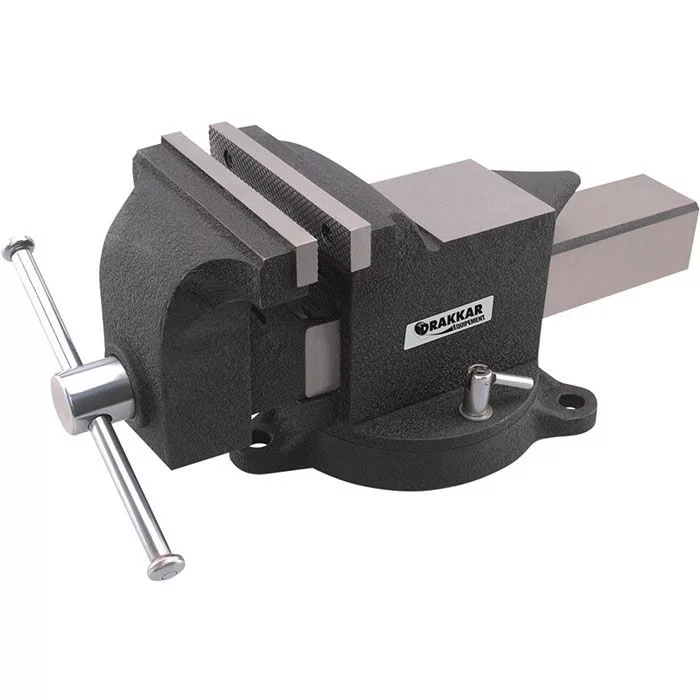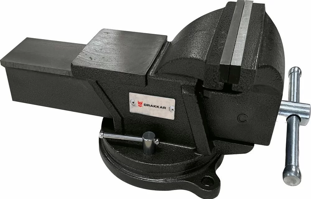 Etau en acier DRAKKAR 150 mm avec base tournante à 360°, enclume et mors à tubes inclus.