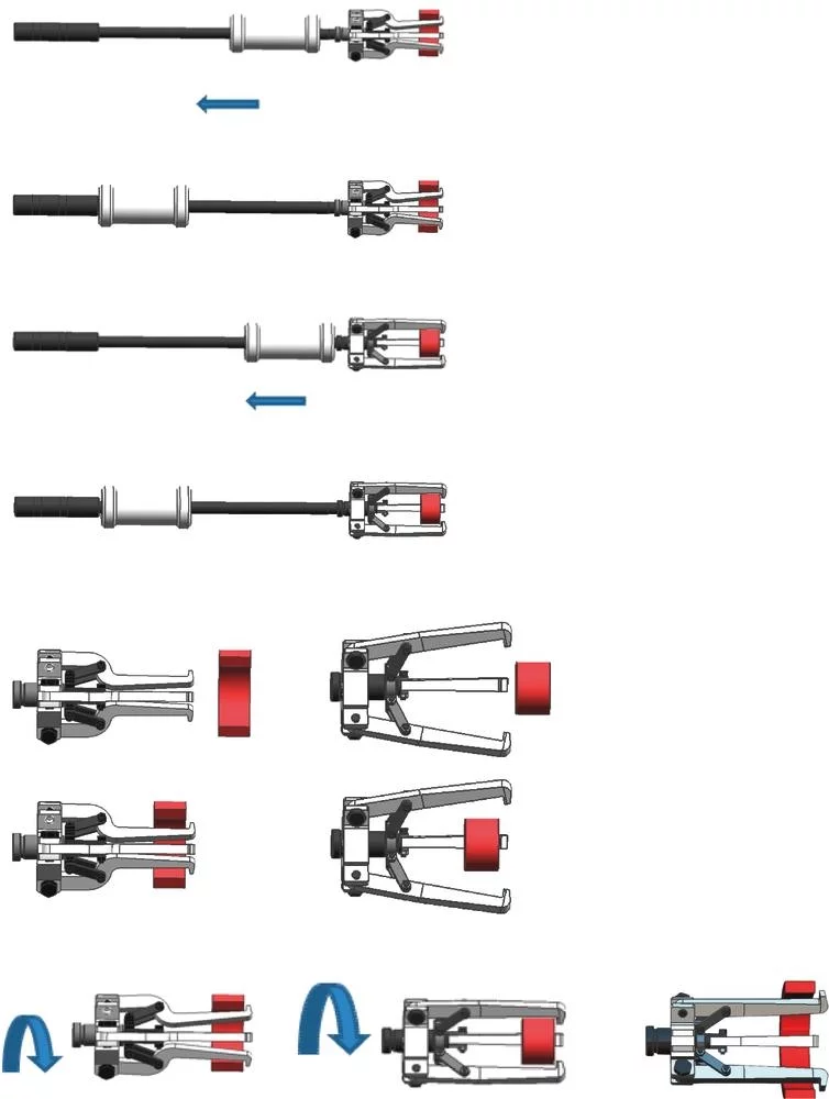 Mise en place des branches puis serrage par rotation de la tête et extraction avec la masse à inertie.