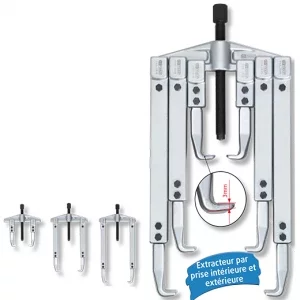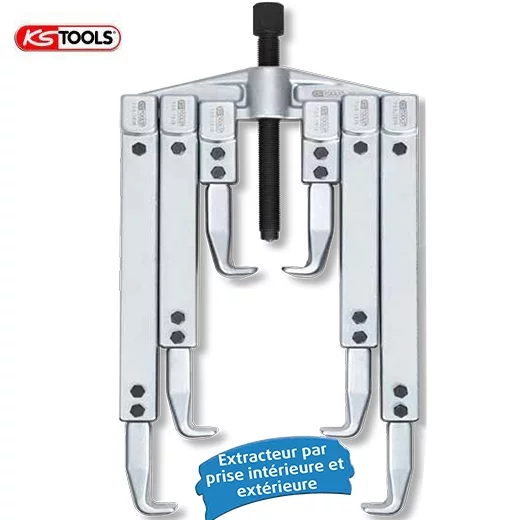 Extracteur 4 griffes 8 pièces KSTOOLS® en acier spécial robuste et polyvalent. Peut être utilisé en prise interne ou externe en inversant les griffes. Les griffes restent parallèles dans toutes les positions et même à pleine charge. Peut être utilisé avec différentes vis de force hydraulique. Vis de force extrêmement robuste avec filetage durci, avec deux bras flexibles. En acier spécial. Garantie à vie ! (dans des conditions normales d’utilisation). Domaines d‘utilisation: Engrenages, roulements, pignons, etc… Caractéristiques techniques: Largeur max d‘extraction: 140mm Profondeur max d‘extraction: 260mm Vis de force avec bille: M14 x 1,5 Longueur/Entraînement vis de force: 155mm/SW17 Couple max de serrage: 80N·m Force max. d‘extraction: 4,0t Poids: 1,4 kg Composition: 1 x Potence 2 griffes 1 x Vis de force 2 x Griffes, longueur 100mm 2 x Griffes, longueur 210mm 2 x Griffes, longueur 260mm Attention: • Conserver la vis de force propre et graissée • Lors de sollicitation importante utiliser de la graisse spéciale filetage