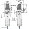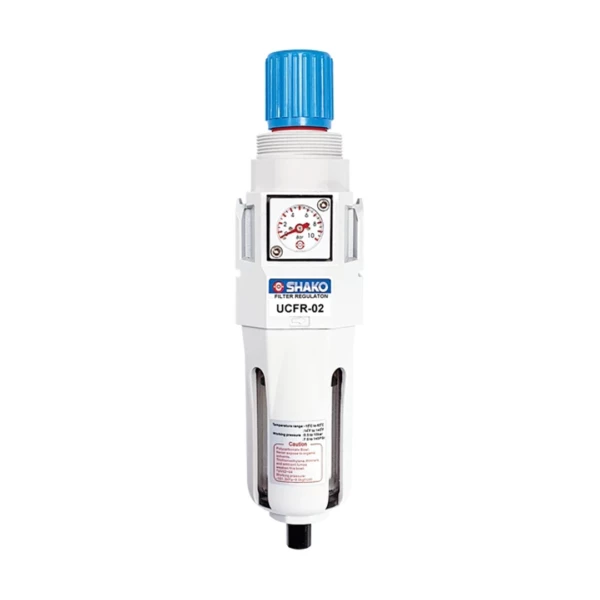 Le filtre régulateur UCFR traite l’air comprimé pour fournir un air filtré à la pression désirée, avec un corps en aluminium robuste et une cuve en polycarbonate avec protection PP, indicateur de niveau et purge semi-automatique.