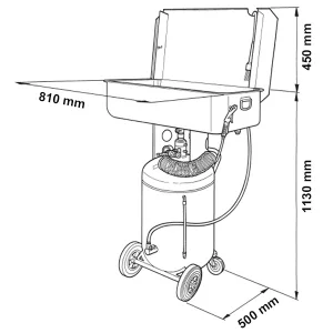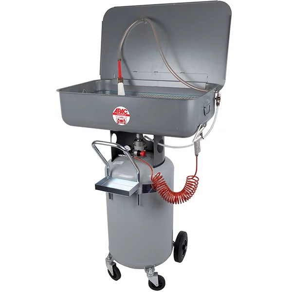 Fontaine de nettoyage APAC pneumatique avec un réservoir intégré d’une capacité de 80 litres.. Structure robuste en acier au carbone avec revêtement epoxydique.