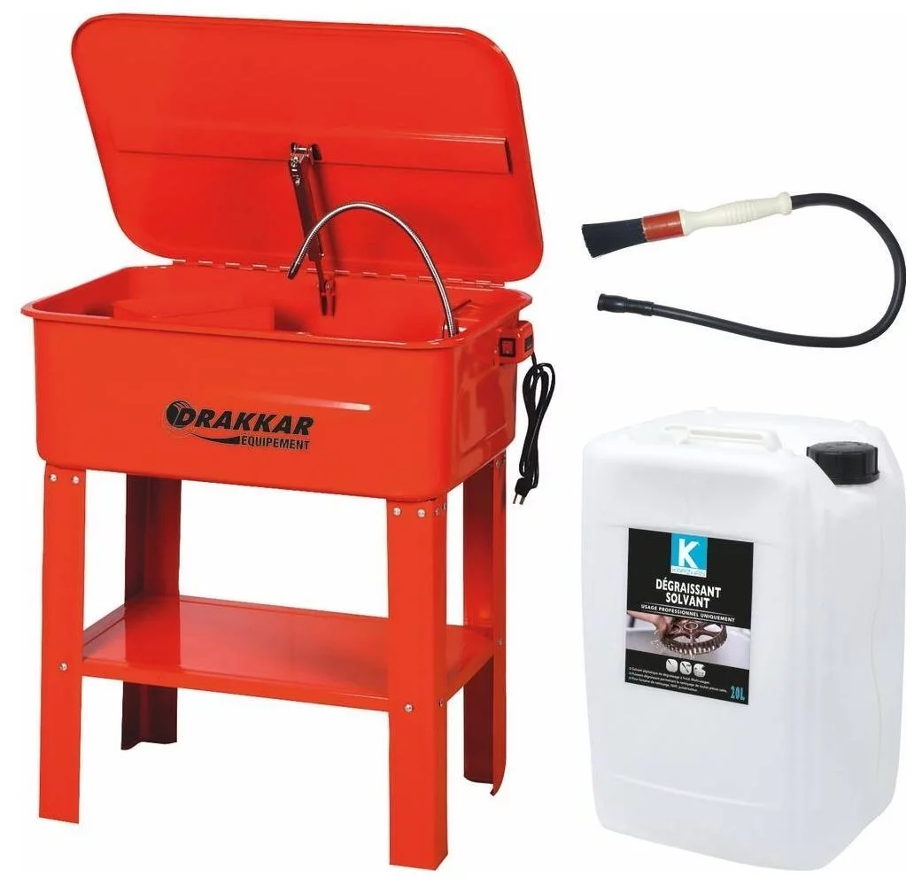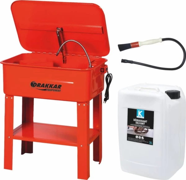 La fontaine comprend un raccord pour tuyau Ø 7 mm et un flexible de 700 mm, offrant une grande mobilité. Elle pèse 66 kg, assurant une stabilité optimale pendant l’utilisation. Ce lot comprend également deux bidons de solvants dégraissants de 20L pour garantir une lubrification et un nettoyage efficace.