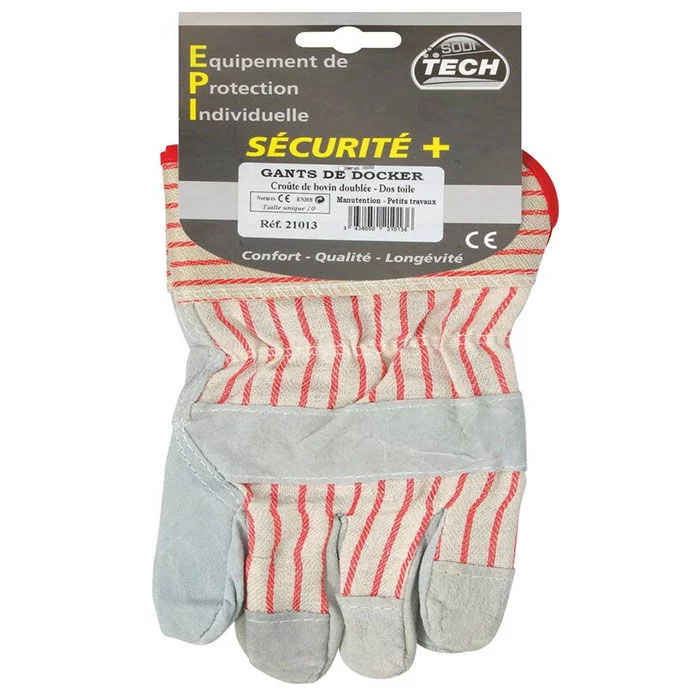 Gants docker croute de bovin T10 – carte avec Cuir croûte de bovin.Renfort sur le dos,Pouce palmé,Protège artèr,Dos et manchette en toile,Doublure intérieure confort en coton,Serrage élastique au dos Utilisations : travaux lourds en milieu sec ou légèrement humide, agriculture, bricolage, manutention, industrie, jardinage. Poids net:0,192 Unite poids:KG Taille:XL (10) Matière:cuir croûte de bovin Type:gants docker Norme:EN 388 – EN 420 Poid article:0.192KG Poids brut:0,192 Picto produit:EN388_3143.eps