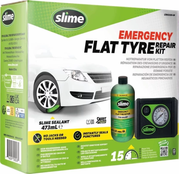 Le kit SMART REPAIR répare tous types de crevaisons en 15 minutes. Le gel SLIME, de couleur verte et composé de glycérine et de fibres végétales, répare les crevaisons jusqu’à 6 mm de diamètre, que ce soit sur la bande de roulement ou le flanc du pneu.