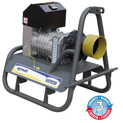 Groupe électrogène agraire WORMS® de 25 kVA. Ce groupe électrogène sur prise de force tracteur délivre du courant triphasé et du courant monophasé. Génératrice livrée avec une fiche mâle monophasée. Spécifications de la génératrice : Type de l’alternateur : 4 pôles IP23 – 1500 tr/min Puissance maximum (400 V Triphasé) : 25 kVA Puissance maximum (230 V monophasé) : 10 kVA Intensité en triphasée : 43 A Fréquence : 50 Hz Puissance prise de force tracteur : 25 kW – 34 CV Vitesse de rotation de la prise de force : 430 tr/min Puissance tracteur conseillée : 50 CV Châssis : mécanosoudé Dimensions : 1140 x 800 x 930 mm Poids : 205 kg Tableau électrique de la génératrice : Protection magnétothermique bipolaire Prise CEE (2P+T) 230V/16A Protection magnétothermique tétrapolaire Prise CEE (3P+N+T+protection) 400V / 63 A Protection interdifférentielle 30mA Équipée de Voltmètre, Fréquencemètre et Ampèremètre