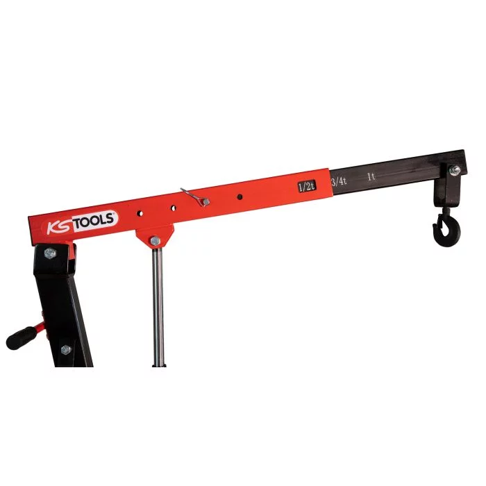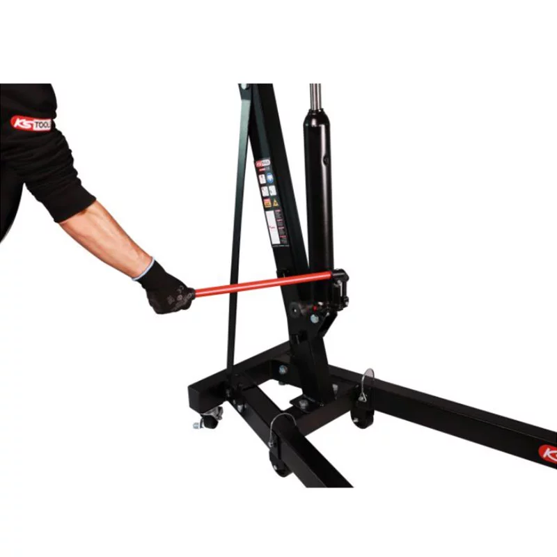 Grue d’atelier 1 tonne pliante de marque KS TOOLS, nouvelle génération, plus stable, plus maniable, idéale pour lever et déplacer des pièces lourdes, chèvre équipée d’une pompe hydraulique à levier. Le bras télescopique est réglable sur 4 positions. La grue mobile est pliable et se range de manière compacte après utilisation. Livré avec un crochet.