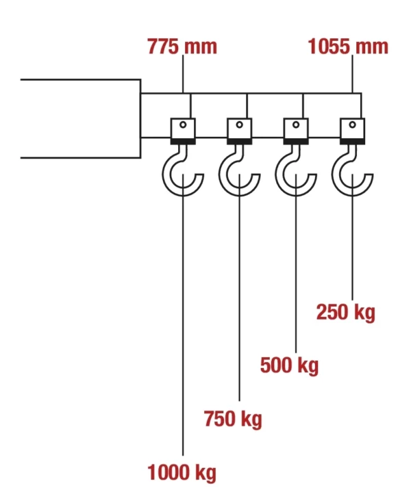 Cette grue a une capacité de levage de 1 tonne. Sa flèche télescopique offre 4 positions de levage : 0.4 Tonnes, 0.6 Tonnes, 0.8 Tonnes et 1 Tonnes.
