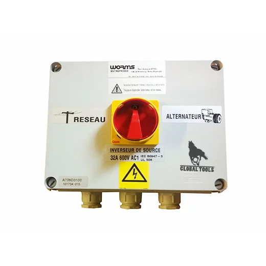 Inverseur de source triphasé 40 A WORMS, pour groupe électrogène essence et diesel jusqu’à 27 kVA. Dispositif manuel permettant de basculer l’alimentation du secteur (EDF) vers votre groupe électrogène en toute sécurité. Inverseur de source Puissance maximale du groupe électrogène : 27 kVA Intensité maximale: 40A – 27 kVA -400V – 3P+N