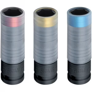Jeu de 3 douilles à choc pour jantes aluminium SLIM POWER 1/2″ KS TOOLS®. Ces douilles ont été conçues pour augmenter leur durée de vie. Munies d’une bague de renfort, celles-ci seront encore utilisables même après avoir été fendues. Garantie à vie (dans les conditions normales d’utilisations). 3 x Douilles aluminium Ø 17,19 et 21 mm 1 x Douille bleue L: 86 mm D1: 26 mm D2: 25.5 mm T: 20 mm Poids: 220 g 1 x Douille jaune L: 86 mm D1: 28 mm D2: 27.5 mm T: 20 mm Poids: 240 g 1 x Douille rouge L: 86 mm D1: 30 mm D2: 20 mm T: 20 mm Poids: 270 g Jeu de douilles à choc pour jantes aluminium SLIM POWER KSTOOLS® 1/2’’