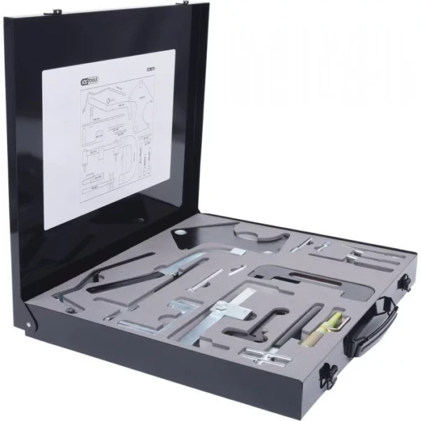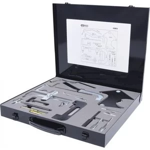 Cette trousse à outils complète KSTOOLS® de calage moteur inclut seize outils importants pour l’alignement de l’arbre à cames, pour tendre, et pour aligner le vilebrequin pour une utilisation sur la plupart des moteurs essence et diesel comprenant: Essence: 1.2/1.4/1.7, 1.4/1.6/1.8/2.0 16v, 2.2 8v, 2.5 20v Diesel: 1.9 D/TD, 2.1/2.2 D/TD, 2.5 D/TD, 2.8 D Garantie à vie ! (dans des conditions normales d’utilisation). Coffret composé de: A – Cheville de blocage de vilebrequin B – M6 Vis de pression de tendeur pour réglage C – Vis M8 x 70 mm D – Cheville de distribution de roue dentée de pompe à injection E – Cheville de distribution de vilebrequin F – Cheville de blocage de volant moteur G – Cheville de fixation de vilebrequin H – Cheville de fixation de vilebrequin I – Outil tendeur pour Renault J – Dispositif de réglage de tendeur K – Dispositif de réglage de tendeur L – Outil de fixation d’arbre à cames M – Outil de tension N – Outil de réglage d’arbre à cames O – Dispositif de réglage de tendeur P – Outil de positionnement de poulie d’arbre à cames (Clio, Laguna, Megane 1.4 -1.6 16v)