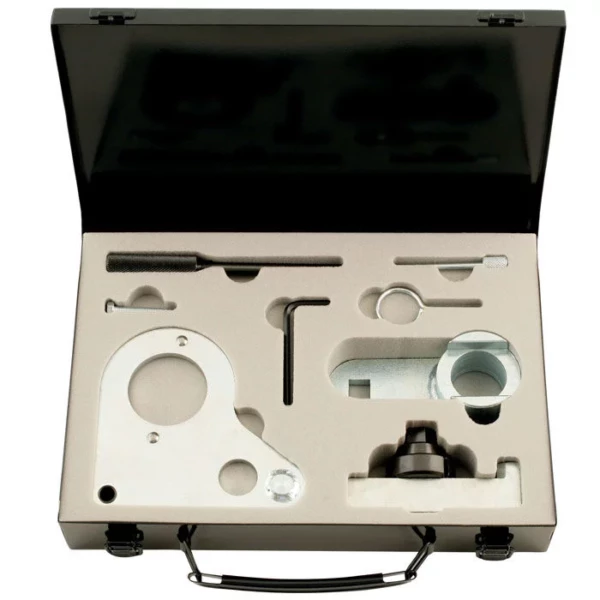 Coffret de reglage moteur, bloque les vilebrequins, grande precision d’ajustage. Remplacer la courroie synchrone. Utilisation: renault nissan opel Emballage: valise en acier Coffret composé de: 8 pieces -Pige de blocage de vilebrequin Ø 8 mm, 144 mm -Outil de mise en place de l’arbre à cames (2) -Cheville de blocage de tendeur de poulie auxillaire -Outil d’extraction de vilebrequin -Outil de desserage de volant moteur (2) -Cheville de blocage de tendeur de chaîne de distribution Ø 3 mm, 65 mm Poids: 2.73 kg