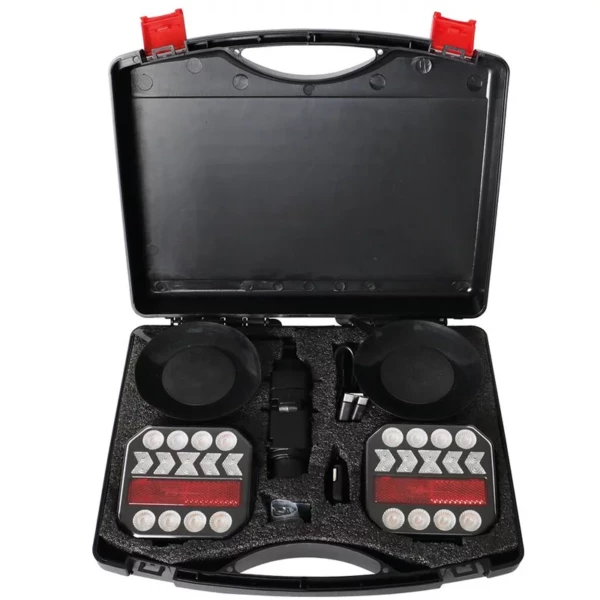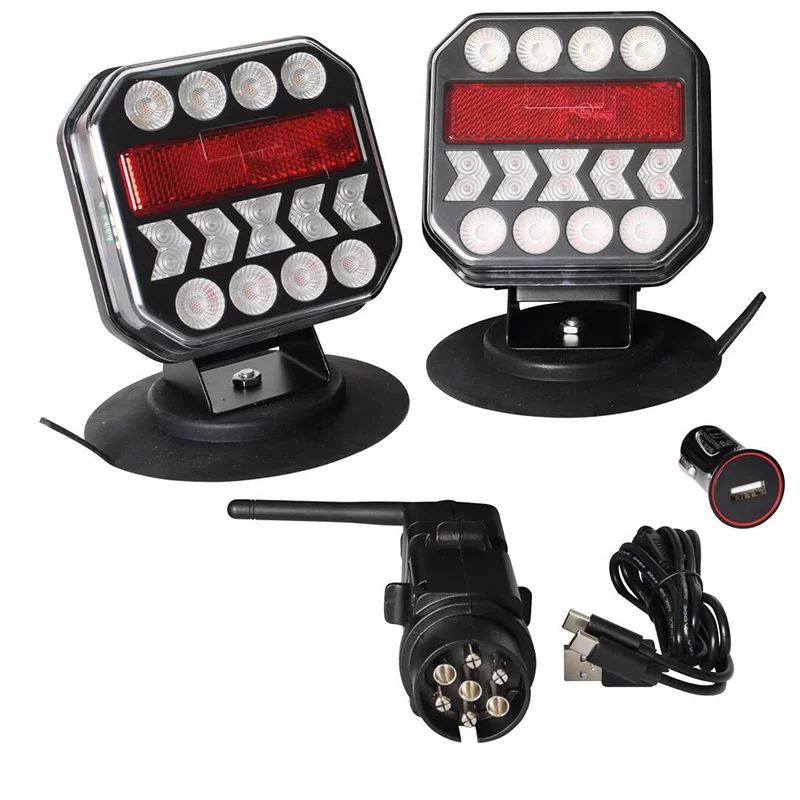 Ce kit de feux offre quatre fonctions essentielles : stop, position, éclairage de plaque et clignotant, avec une prise 7 plots. Il dispose d’une batterie puissante de 2600mAh pour une grande autonomie, un témoin de charge et une portée de communication de 30m. Facile à installer grâce à sa fixation magnétique, il inclut un câble USB-C, des feux gauche et droit, un transmetteur, et une prise allume-cigare.