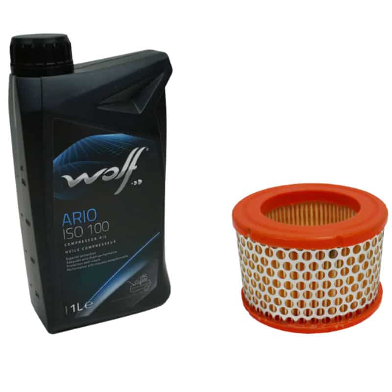 Kit révision NB4/5 pour compresseur à pistons NUAIR. Ce kit comprend un filtre à air et un bidon de 1 litre d’huile minérale ISO100