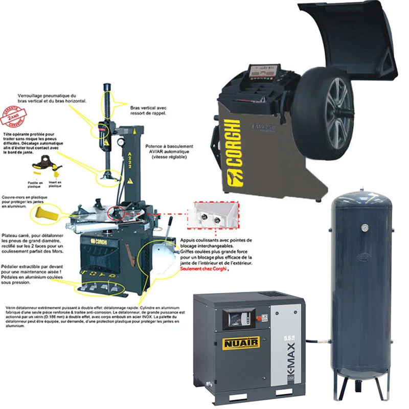 Kit pour garage automobile composé d’une équilibreuse de roues, d’une machine à pneus et d’un compresseur avec réservoir de 500 litres. Ensemble complet avec matériels de grandes marques. Ce kit garagiste est proposer pour une utilisation soutenu.