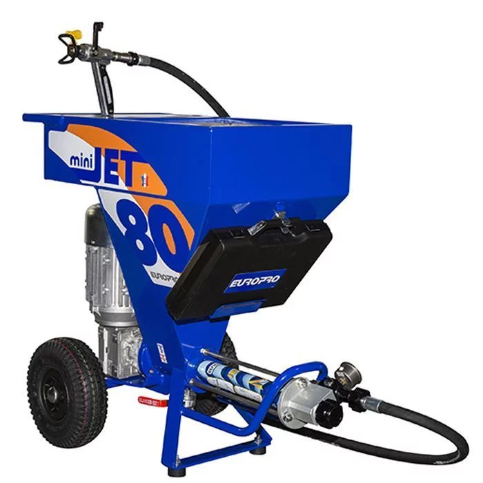 La MINIJET 80 permet d’appliquer tout type d’enduit pelliculaire en pâte. C’est une machine compacte, silencieuse et légère qui passe partout.Une personne peut la monter et la descendre dans les escaliers de par son châssis type « diable ».Le nettoyage rapide doit s’effectuer uniquement en fin de chantier et la pompe se change rapidement sur chantier. Caractérisiques : Pression de travail maxi : 80 bar Débit de produit maxi : 4,5 L/min Moteur électrique : 1,5 kW Alimentation : 230 V / 50 et 60 Hz Type de pompe : à vis volumétrique Pompe : JET 1 Capacité cuve : 45 L Buse maxi (neuve) : 0,045″ Dimensions (L x l x h) : 660 x 430 x 710 mm Niveau sonore : 91 Lwa Poids : 53 kg Livré avec : 1 tuyau Ø16 x 10 m 1 pistolet Jetpro avec support de buse 1 buse TT3 443 1 mallette contenant : -1 clé mixte de 17 -1 clé fourche 22/32 -1 pince multiprise -3 clés 6 pans Ø2, 5 et 8 -2 balles et 1 brosse de nettoyage -1 L de liquide de stockage Option disponible (voir plus haut) : Tuyaux produit Ø16 x 10 m Tuyaux produit Ø19 x 10 m