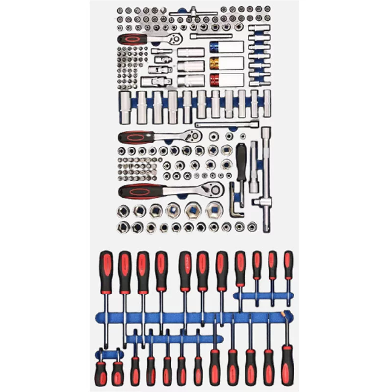 En premier lieu, le meuble comprend cinq éléments essentiels. Tels qu’une table de travail robuste, des tiroirs spacieux et des étagères pratiques. Grâce à sa conception bien pensée, vous disposez d’un espace de travail agréable et fonctionnel. Ensuite, les 237 outils inclus couvrent une large gamme de besoins, allant des clés à molette aux tournevis, en passant par les pinces.
