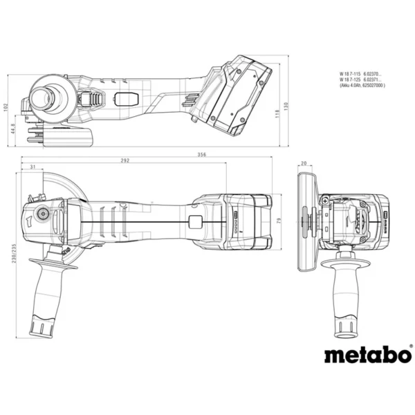 Meuleuse d’angle diamètre 125 mm METABO. Équipée d’une protection contre la surcharge, d’un démarrage progressif électronique pour un démarrage sans à-coup, d’une protection anti redémarrage. Livrée sans disque, sans chargeur, sans batterie.