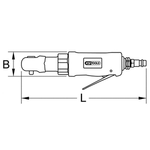 Clé à rochet KS TOOLS. Cette clé est équipée d’un carré d’entraînement avec bille de maintien selon DIN 3120 / ISO 1174, d’une sortie d’air vers l’arrière de la poignée avec inverseur du sens de rotation (gauche/droite), d’une réglage de vitesse continue d’un système d’atténuation des vibrations. Livrée avec un connecteur de raccord 1/4″.