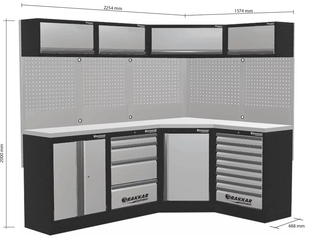 Les trois panneaux perforés en acier de 2 mm optimisent l’espace mural, et les panneaux d’angle augmentent le rangement suspendu.