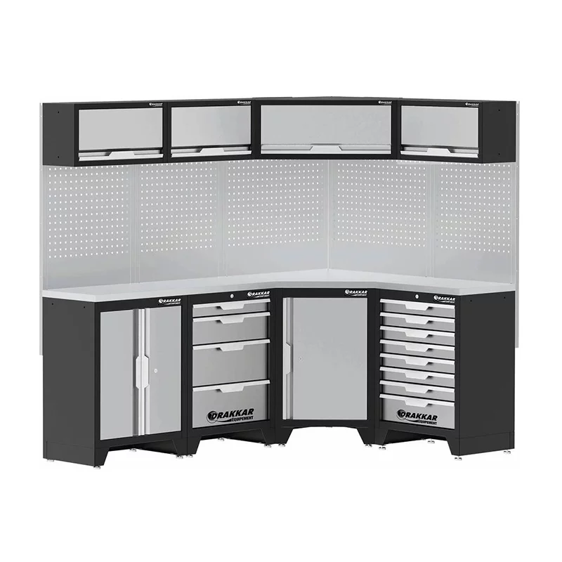 Il comprend des meubles bas à tiroirs et portes, des panneaux perforés en acier pour organiser facilement vos outils et accessoires.