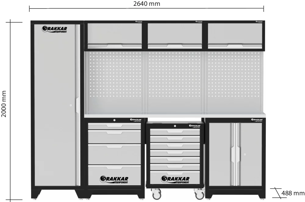 Avec des dimensions de 2640 x 488 x 2000 mm, ce mobilier assure stabilité dans votre atelier.