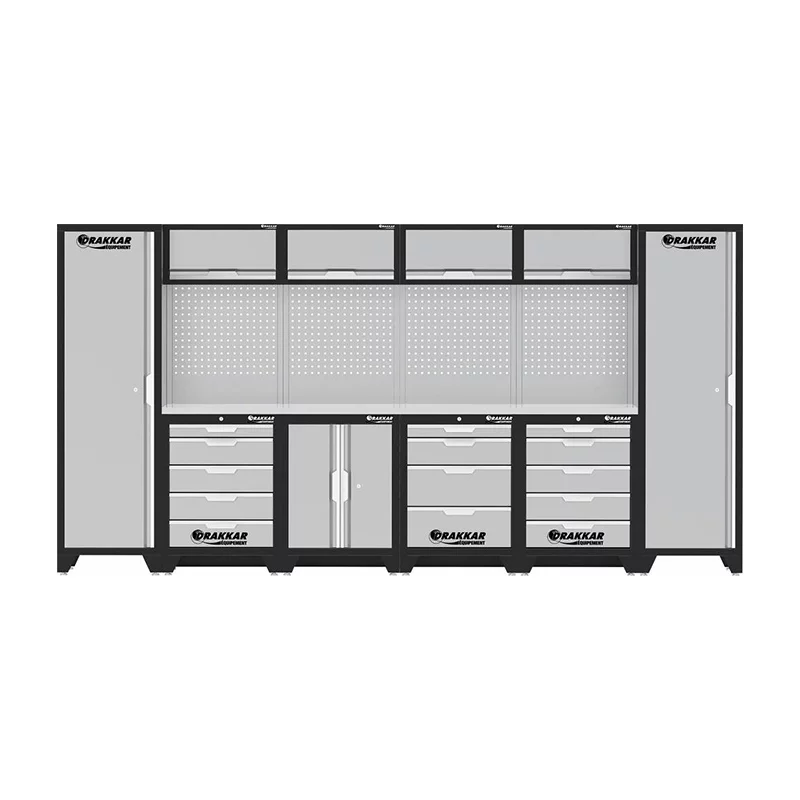 Les panneaux perforés en tôle acier de 2 mm d’épaisseur sont inclus, offrant une solution de stockage supplémentaire. Vous trouverez également deux plans de travail en inox de 1361x463x38 mm, parfaits pour une surface de travail robuste et esthétique.
