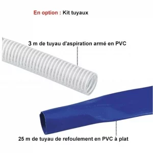 • Kit tuyaux : 3 mètres de tuyau d’aspiration + 25 mètres de tuyau de refoulement.